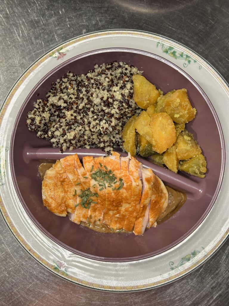 Semaine 43: Filet de poulet sauce Satay (cacahuètes et soja), carotte jaune du Doubs glacées, quinoa bicolore 15.- Dans la boite ReCIRCLE à 10.- ou 0.- à l’échange.