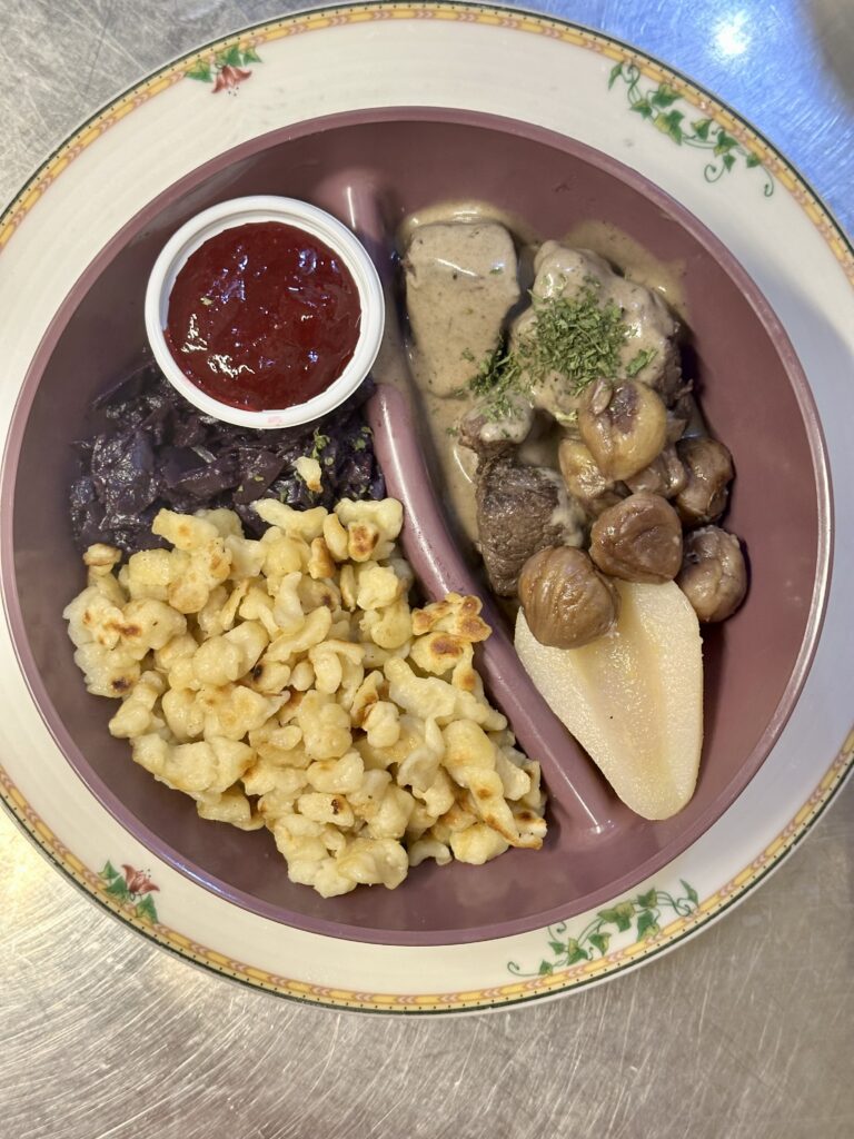 Semaine 44: Civet de cerf (EU), spätzlis, chou rouge, poire cuite et confipote d’airelles, marrons glacés. 19.- Dans la boite ReCIRCLE à 10.- ou 0.- à l’échange.