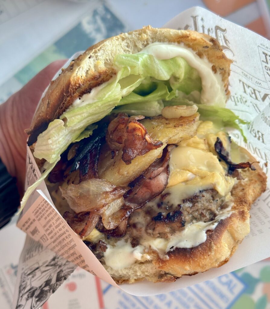 Pain, steak haché de bœuf, reblochon de Moudon, galette de rösti, lard, oignons caramélisés, mayonnaise, salade.